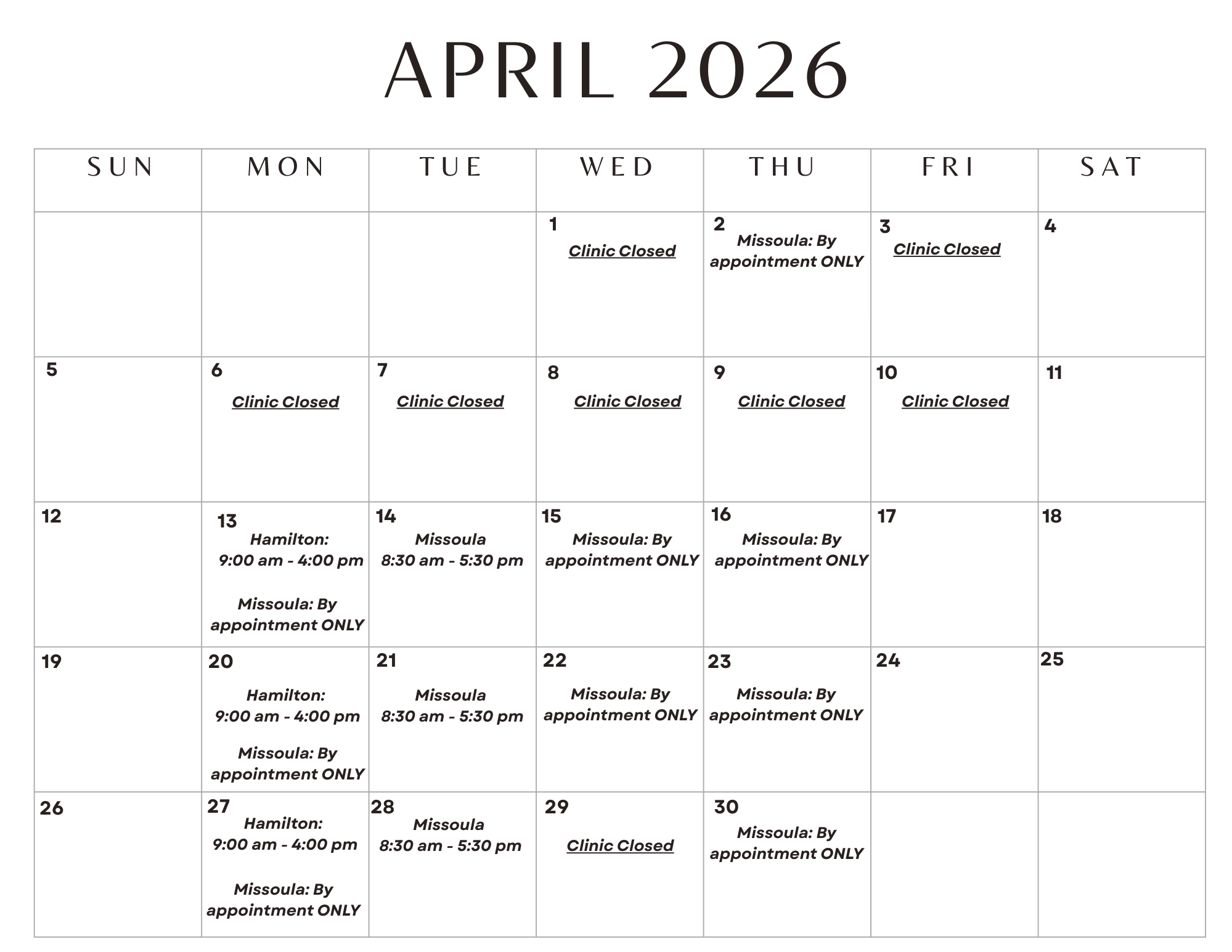 Upcoming Closures: Hamilton: 3/16/2026, 4/6/2026Missoula: 3/5/2026, 4/1/2026, 4/3/2026-4/9/2026, 4/29/2026